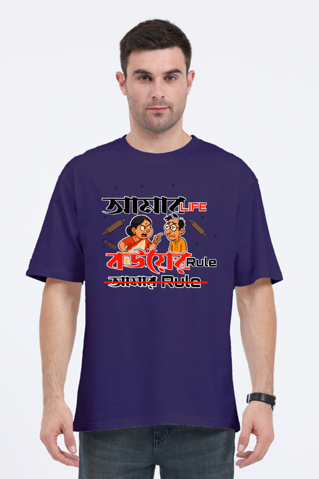 Bold Bengali vibes meet premium streetwear! This heavyweight oversized T-shirt is built with 240 GSM 100% cotton, giving you the perfect mix of comfort, durability, and swag. The quirky “Amar Life Bouder Rule” graphic adds humor and attitude, making it a true standout piece.